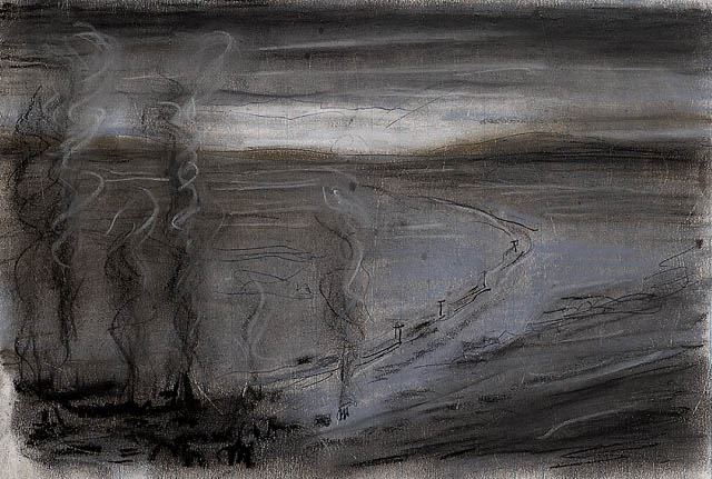 The sun slowly rises. Long shot of the sunrise over the town. Eventually, we see a few cars driving at a snail's pace away down the desert road. We sense that this town has died this night. It will be written off the maps forever.
