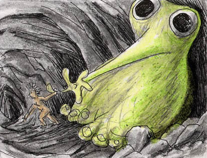 At last they popped out into a little pocket in the earth, crowded with tiny creatures that looked just like Chew. A strange twilight suffused this little burrow, a green and purplish luminescence that emanated from a myriad of roots that made up the walls of the strange place. Minute sparks, blue and pink and gold, floated through the burrow and among the many Theeroi who were huddled there in knots. They were dirty, as Chew was, and all had just come back from their terrific battle. Many were wounded, and others tended to their wounds. All of them had bellies that were huge and distended, from the many demons they had gobbled up in the furious fighting. None of them were pleased to see this captured demon, and all of them were too tired, or too full, to be bothered with the business of eating him at that moment. But they all gave voice to an angry growl, which so terrified little Tweek that he gave out a hopeless squeak of fear.